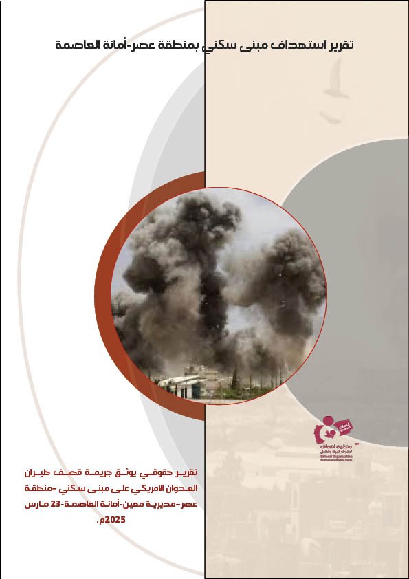اصدرت منظمة انتصاف لحقوق المرأة والطفل تقريراً حقوقياً بعنوان ” استهداف مبنى سكني بمنطقة عصر- أمانة العاصمة” حيث تناول التقرير جريمة قصف طيران العدوان الامريكي على مبني سكني بمنطقة عصر بمديرية معين بأمانة العاصمة صنعاء والتي راح ضحيتها مدنيين بينهم نساء و أطفال، وذلك بتاريخ 23 مارس 2025م
