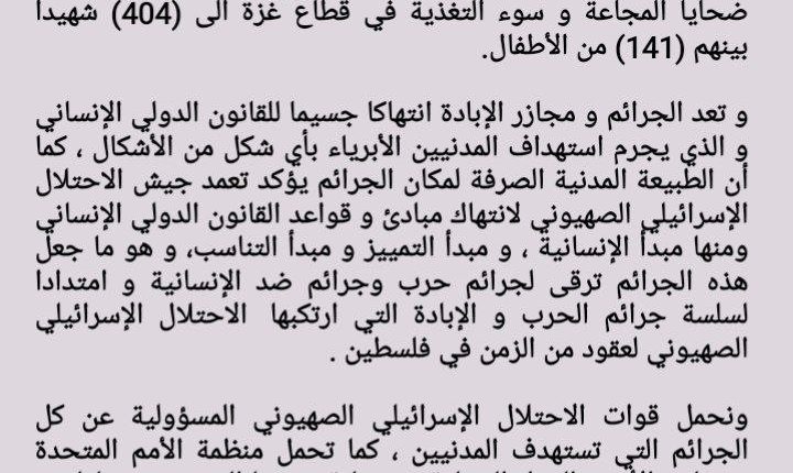 ندين و نستنكر بأشد العبارات استمرار سلسلة جرائم عدوان الاحتلال الإسرائيلي الصهيوني على الشعب الفلسطيني، حيث ارتفعت حصيلة ضحايا المجاعة و سوء التغذية في قطاع غزة الى (404) شهيدا بينهم (141) من الأطفال.