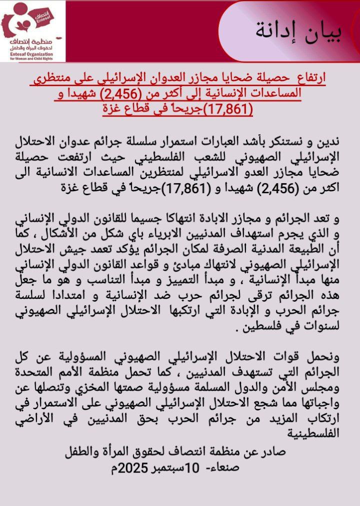 ندين و نستنكر بأشد العبارات استمرار سلسلة جرائم عدوان الاحتلال الإسرائيلي الصهيوني للشعب الفلسطيني حيث ارتفعت حصيلة ضحايا مجازر العدو الاسرائيلي لمنتظرين المساعدات الانسانية الى اكثر من (2,465) شهيدا و (17,948)جريحاً في قطاع غزة