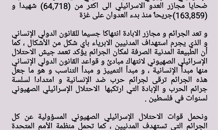 ندين و نستنكر بأشد العبارات استمرار سلسلة جرائم عدوان الاحتلال الإسرائيلي الصهيوني للشعب الفلسطيني حيث ارتفعت حصيلة ضحايا مجازر العدو الاسرائيلي الى اكثر من (64,718) شهيدا و (163,859)جريحاً منذ بدء العدوان على غزة