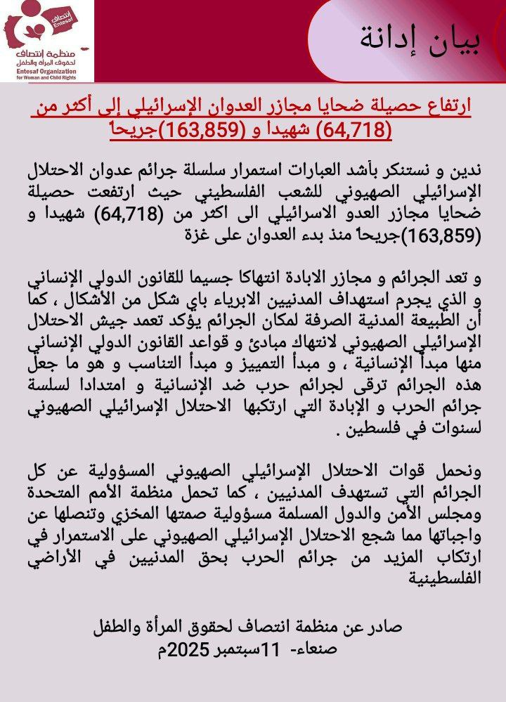 ندين و نستنكر بأشد العبارات استمرار سلسلة جرائم عدوان الاحتلال الإسرائيلي الصهيوني للشعب الفلسطيني حيث ارتفعت حصيلة ضحايا مجازر العدو الاسرائيلي الى اكثر من (64,718) شهيدا و (163,859)جريحاً منذ بدء العدوان على غزة