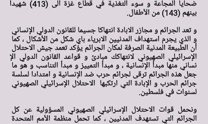 ندين و نستنكر بأشد العبارات استمرار سلسلة جرائم عدوان الاحتلال الإسرائيلي الصهيوني على الشعب الفلسطيني، حيث ارتفعت حصيلة ضحايا المجاعة و سوء التغذية في قطاع غزة الى (413) شهيدا بينهم (143) من الأطفال.