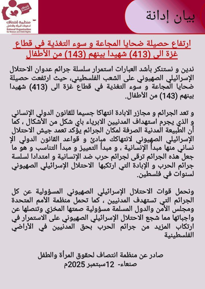 ندين و نستنكر بأشد العبارات استمرار سلسلة جرائم عدوان الاحتلال الإسرائيلي الصهيوني على الشعب الفلسطيني، حيث ارتفعت حصيلة ضحايا المجاعة و سوء التغذية في قطاع غزة الى (413) شهيدا بينهم (143) من الأطفال.