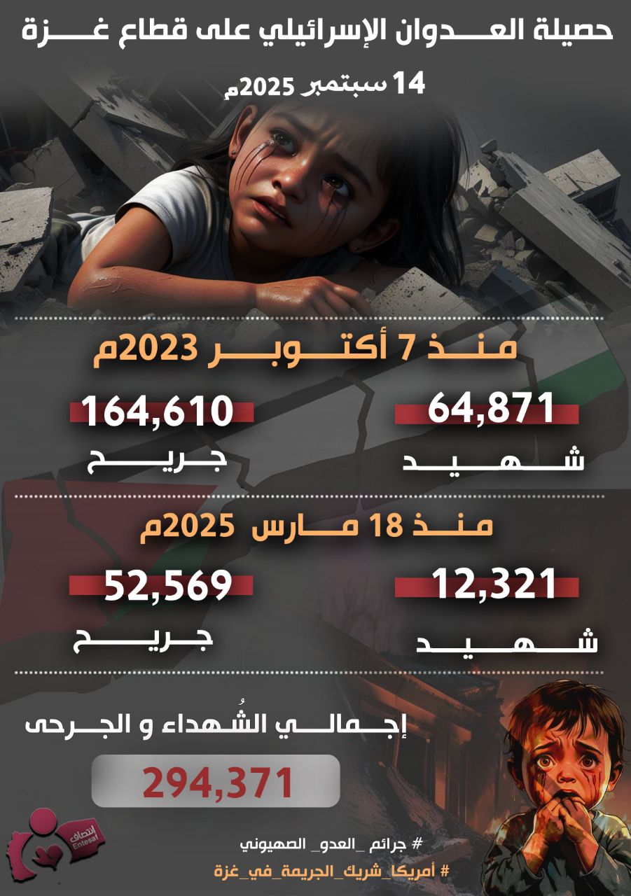 حصيلة العدوان الإسرائيلي على قطاع غزة 14 سبتمبر 2025م