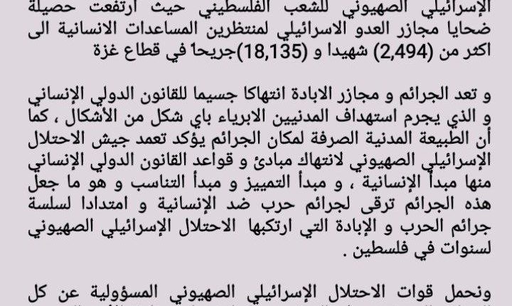 ندين و نستنكر بأشد العبارات استمرار سلسلة جرائم عدوان الاحتلال الإسرائيلي الصهيوني للشعب الفلسطيني حيث ارتفعت حصيلة ضحايا مجازر العدو الاسرائيلي لمنتظرين المساعدات الانسانية الى اكثر من (2,494) شهيدا و (18,135)جريحاً في قطاع غزة
