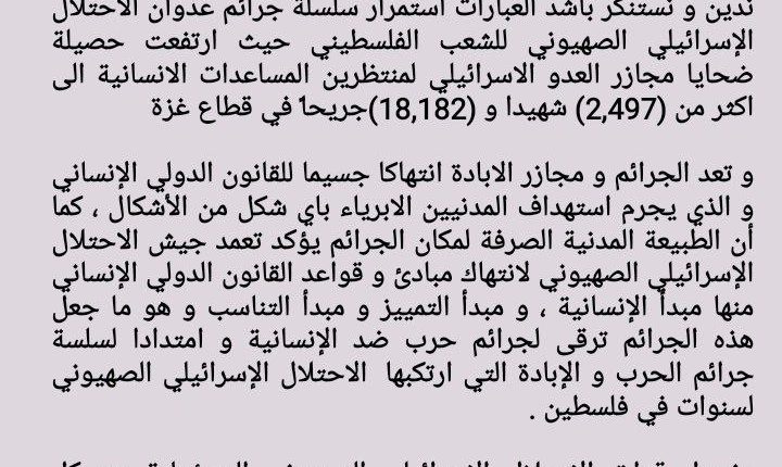 ندين و نستنكر بأشد العبارات استمرار سلسلة جرائم عدوان الاحتلال الإسرائيلي الصهيوني للشعب الفلسطيني حيث ارتفعت حصيلة ضحايا مجازر العدو الاسرائيلي لمنتظرين المساعدات الانسانية الى اكثر من (2,497) شهيدا و (18,182)جريحاً في قطاع غزة