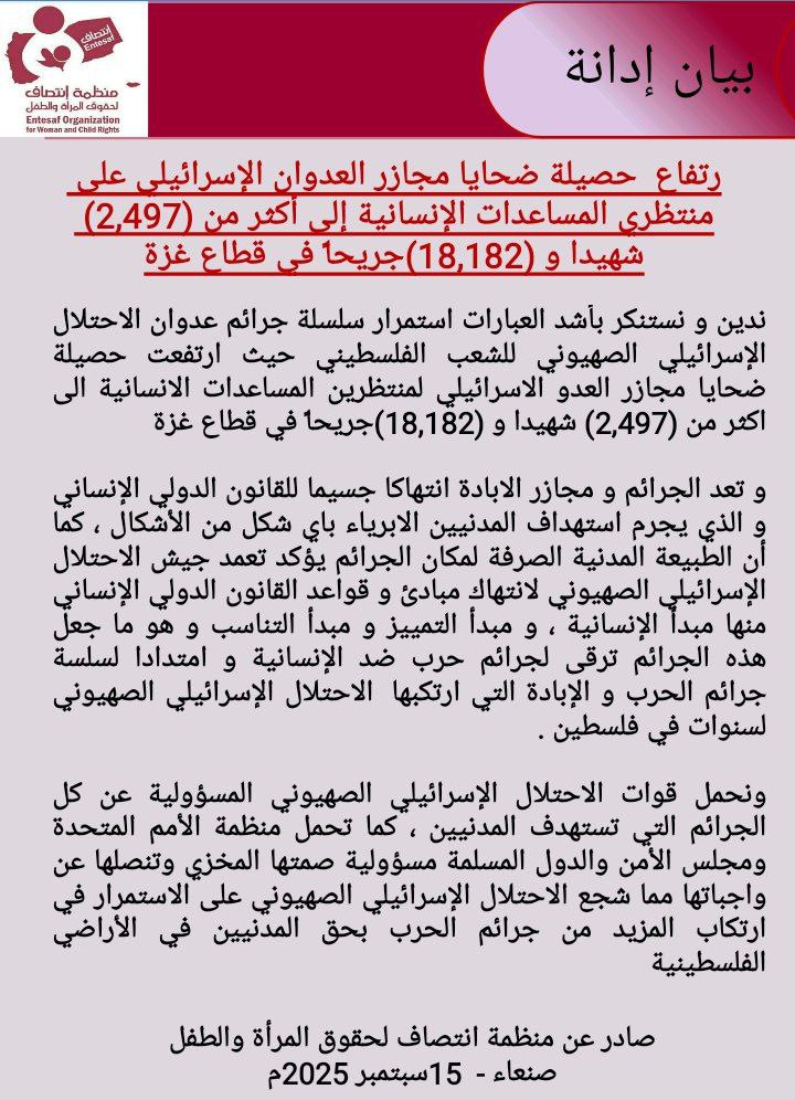 ندين و نستنكر بأشد العبارات استمرار سلسلة جرائم عدوان الاحتلال الإسرائيلي الصهيوني للشعب الفلسطيني حيث ارتفعت حصيلة ضحايا مجازر العدو الاسرائيلي لمنتظرين المساعدات الانسانية الى اكثر من (2,497) شهيدا و (18,182)جريحاً في قطاع غزة