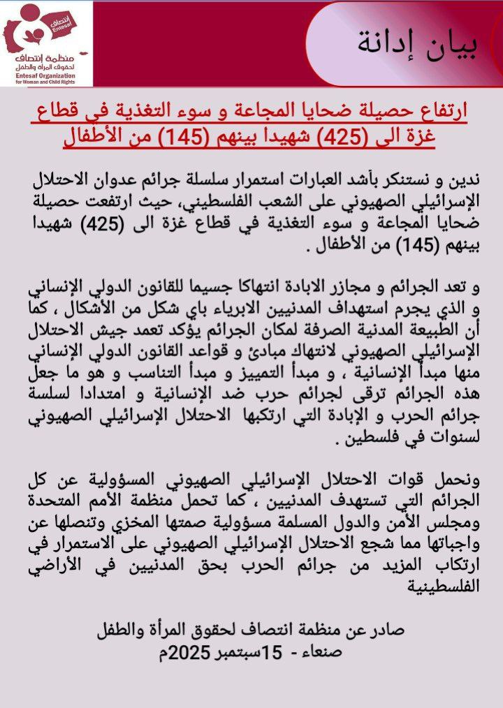 ندين و نستنكر بأشد العبارات استمرار سلسلة جرائم عدوان الاحتلال الإسرائيلي الصهيوني على الشعب الفلسطيني، حيث ارتفعت حصيلة ضحايا المجاعة و سوء التغذية في قطاع غزة الى (425) شهيدا بينهم (145) من الأطفال.