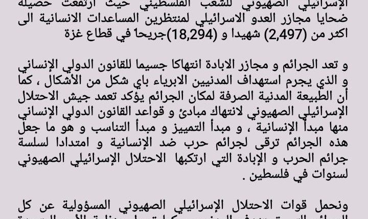 ندين و نستنكر بأشد العبارات استمرار سلسلة جرائم عدوان الاحتلال الإسرائيلي الصهيوني للشعب الفلسطيني حيث ارتفعت حصيلة ضحايا مجازر العدو الاسرائيلي لمنتظرين المساعدات الانسانية الى اكثر من (2,497) شهيدا و (18,294)جريحاً في قطاع غزة