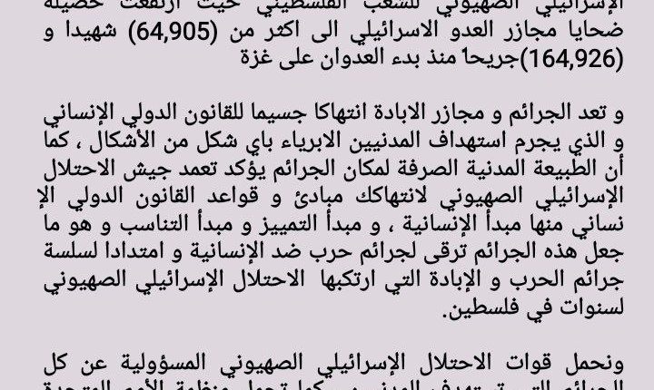 ندين و نستنكر بأشد العبارات استمرار سلسلة جرائم عدوان الاحتلال الإسرائيلي الصهيوني للشعب الفلسطيني حيث ارتفعت حصيلة ضحايا مجازر العدو الاسرائيلي الى اكثر من (64,905) شهيدا و (164,926)جريحاً منذ بدء العدوان على غزة