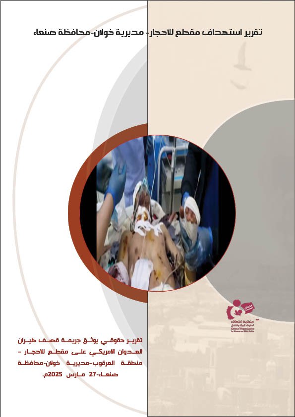 اصدرت منظمة انتصاف لحقوق المرأة والطفل تقريراً حقوقياً بعنوان “تقرير استهداف مقطع للاحجار بمديرية خولان بمحافظة صنعاء ” حيث تناول التقرير جريمة قصف طيران العدوان الامريكي على مقطع للاحجار بمنطقة العرقوب بمديرية خولان بمحافظة صنعاء والتي راح ضحيتها مدنيين بينهم نساء و أطفال، وذلك بتاريخ 27 مارس 2025م