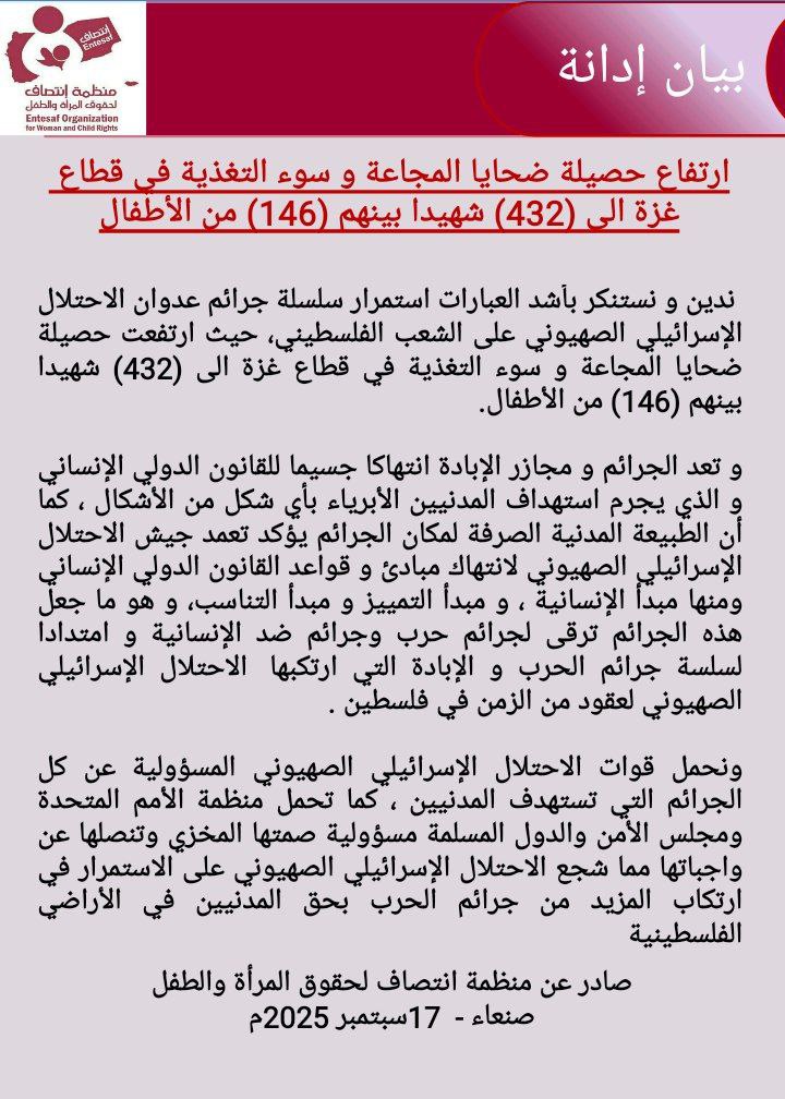 ندين و نستنكر بأشد العبارات استمرار سلسلة جرائم عدوان الاحتلال الإسرائيلي الصهيوني على الشعب الفلسطيني، حيث ارتفعت حصيلة ضحايا المجاعة و سوء التغذية في قطاع غزة الى (432) شهيدا بينهم (146) من الأطفال.
