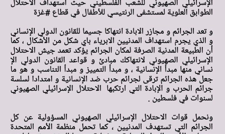 ندين و نستنكر بأشد العبارات استمرار سلسلة جرائم عدوان الاحتلال الإسرائيلي الصهيوني للشعب الفلسطيني حيث استهداف الاحتلال الطوابق العلوية لمستشفى الرنتيسي للأطفال في قطاع #غزة