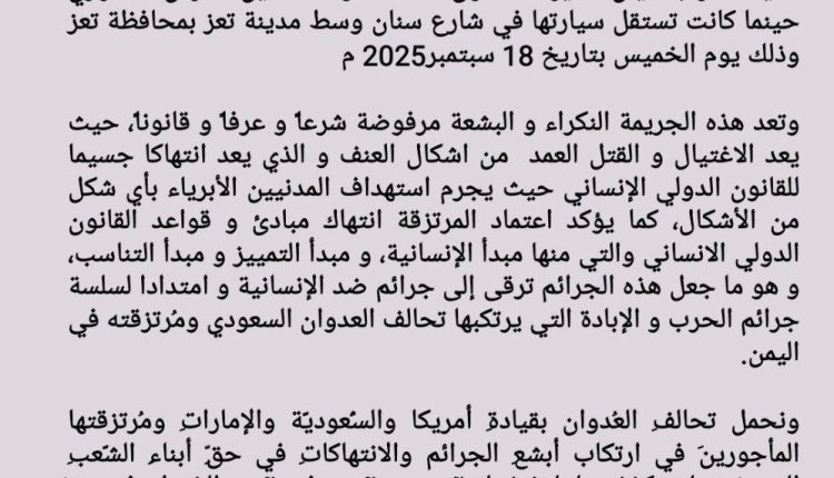 ندين و نستنكر بأشد العبارات الجريمة البشعة التي ارتكبها مسلحون في مدينة تعز باغتيال مديرة صندوق النظافة و التحسين افتهان المشهري حينما كانت تستقل سيارتها في شارع سنان وسط مدينة تعز بمحافظة تعز وءلك يوم الخميس بتاريخ 18 سبتمبر 2025م
