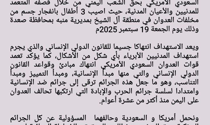 ندين ونستنكر بأشد العبارات استمرار جرائم و مجازر تحالف العدوان السعودي الأمريكي بحق الشعب اليمني من خلال قصفه المتعمد للمدنيين والأعيان المدنية، حيث اصيب 3 أطفال بانفجار جسم من مخلفات العدوان في منطقة آل الشيخ بمديرية منبه بمحافظة صعدة وذلك يوم الجمعة 19 سبتمبر 2025م