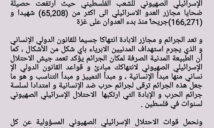 ندين و نستنكر بأشد العبارات استمرار سلسلة جرائم عدوان الاحتلال الإسرائيلي الصهيوني للشعب الفلسطيني حيث ارتفعت حصيلة ضحايا مجازر العدو الاسرائيلي الى اكثر من (65,208) شهيدا و (166,271)جريحاً منذ بدء العدوان على غزة