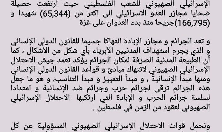 ندين و نستنكر بأشد العبارات استمرار سلسلة جرائم عدوان الاحتلال الإسرائيلي الصهيوني للشعب الفلسطيني حيث ارتفعت حصيلة ضحايا مجازر العدو الاسرائيلي الى اكثر من (65,344) شهيدا و (166,795)جريحاً منذ بدء العدوان على غزة