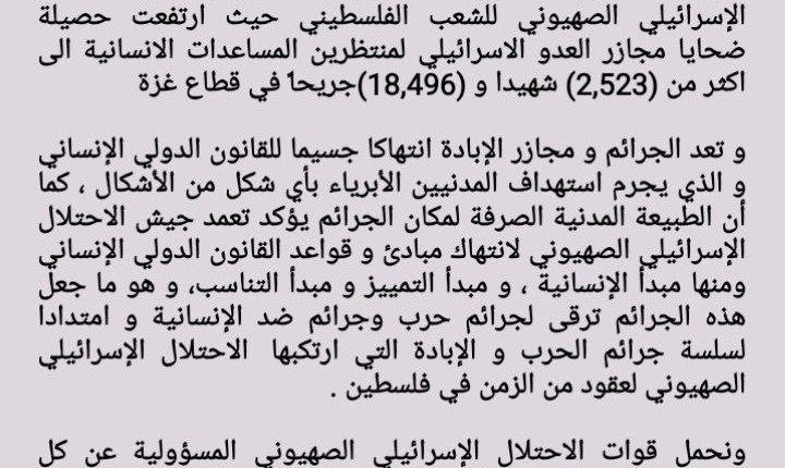 ندين و نستنكر بأشد العبارات استمرار سلسلة جرائم عدوان الاحتلال الإسرائيلي الصهيوني للشعب الفلسطيني حيث ارتفعت حصيلة ضحايا مجازر العدو الاسرائيلي لمنتظرين المساعدات الانسانية الى اكثر من (2,523) شهيدا و (18,496)جريحاً في قطاع غزة