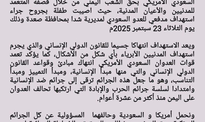 ندين ونستنكر بأشد العبارات استمرار جرائم و مجازر تحالف العدوان السعودي الأمريكي بحق الشعب اليمني من خلال قصفه المتعمد للمدنيين والأعيان المدنية، حيث اصيبت طفلة بجروح جراء استهداف مدفعي للعدو السعودي لمديرية شدا بمحافظة صعدة وذلك يوم الثلاثاء 23 سبتمبر 2025م
