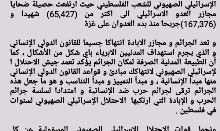 ندين و نستنكر بأشد العبارات استمرار سلسلة جرائم عدوان الاحتلال الإسرائيلي الصهيوني للشعب الفلسطيني حيث ارتفعت حصيلة ضحايا مجازر العدو الاسرائيلي الى اكثر من (65,427) شهيدا و (167,376)جريحاً منذ بدء العدوان على غزة