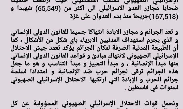 ندين و نستنكر بأشد العبارات استمرار سلسلة جرائم عدوان الاحتلال الإسرائيلي الصهيوني للشعب الفلسطيني حيث ارتفعت حصيلة ضحايا مجازر العدو الاسرائيلي الى اكثر من (65,549) شهيدا و (167,518)جريحاً منذ بدء العدوان على غزة