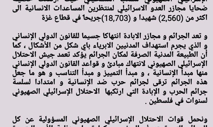 ندين و نستنكر بأشد العبارات استمرار سلسلة جرائم عدوان الاحتلال الإسرائيلي الصهيوني للشعب الفلسطيني حيث ارتفعت حصيلة ضحايا مجازر العدو الاسرائيلي لمنتظرين المساعدات الانسانية الى اكثر من (2,560) شهيدا و (18,703)جريحاً في قطاع غزة