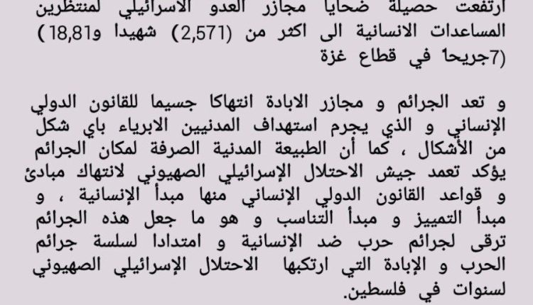 ندين و نستنكر بأشد العبارات استمرار سلسلة جرائم عدوان الاحتلال الإسرائيلي الصهيوني للشعب الفلسطيني حيث ارتفعت حصيلة ضحايا مجازر العدو الاسرائيلي لمنتظرين المساعدات الانسانية الى اكثر من (2,571) شهيدا و (18,817)جريحاً في قطاع غزة