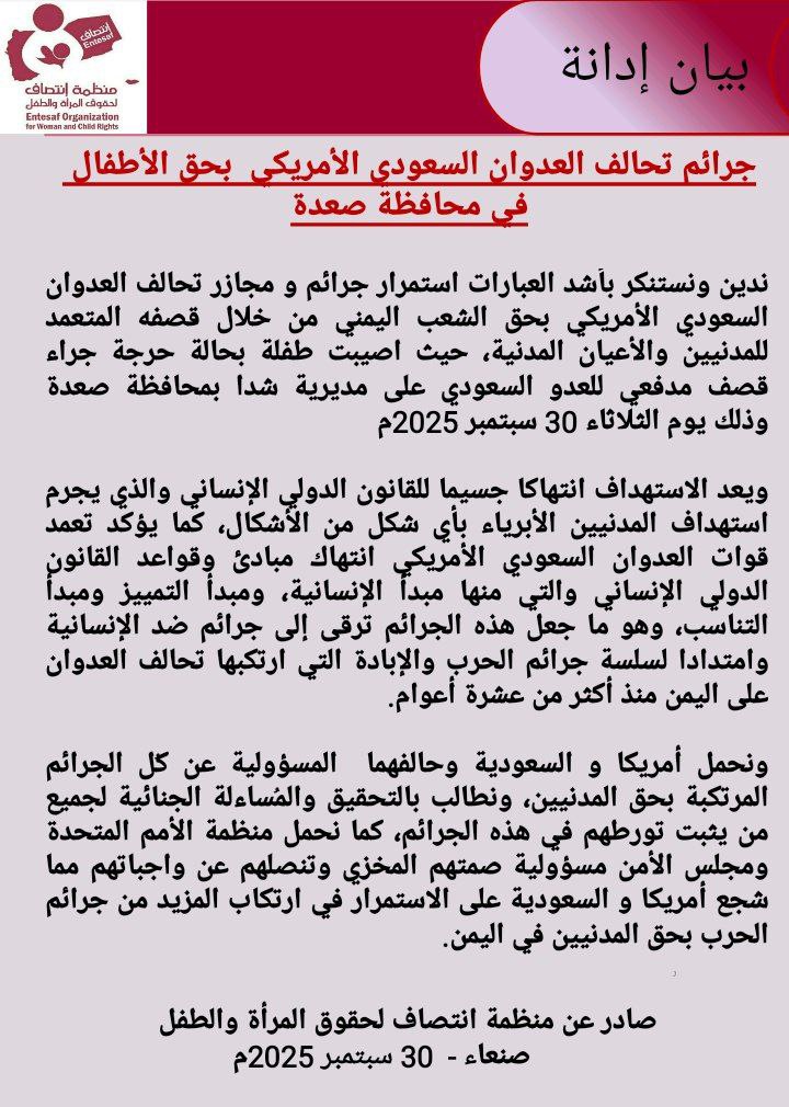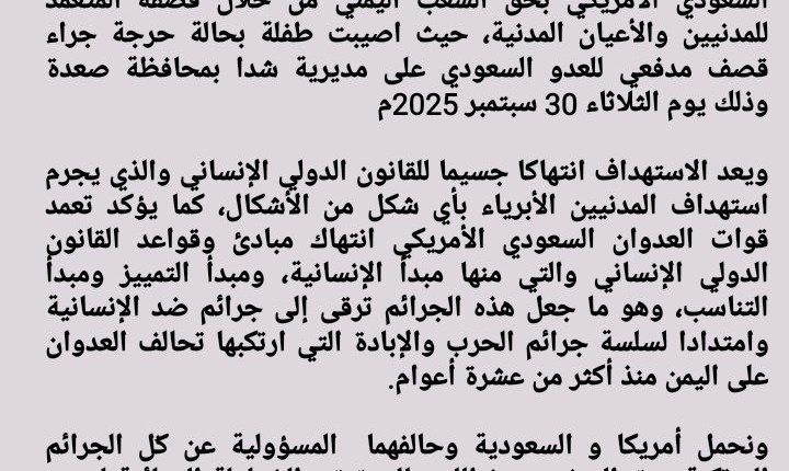 ندين ونستنكر بأشد العبارات استمرار جرائم و مجازر تحالف العدوان السعودي الأمريكي بحق الشعب اليمني من خلال قصفه المتعمد للمدنيين والأعيان المدنية، حيث اصيبت طفلة بحالة حرجة جراء قصف مدفعي للعدو السعودي على مديرية شدا بمحافظة صعدة وذلك يوم الثلاثاء 30 سبتمبر 2025م