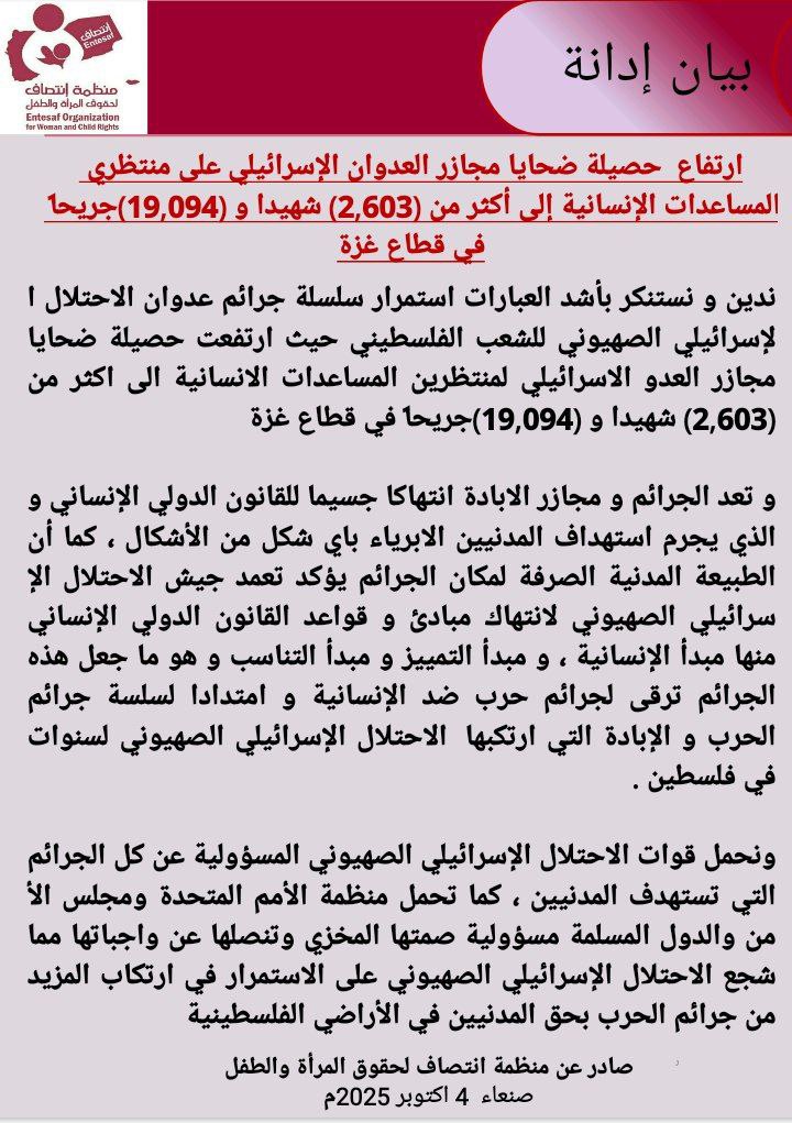ندين و نستنكر بأشد العبارات استمرار سلسلة جرائم عدوان الاحتلال الإسرائيلي الصهيوني للشعب الفلسطيني حيث ارتفعت حصيلة ضحايا مجازر العدو الاسرائيلي لمنتظرين المساعدات الانسانية الى اكثر من (2,603) شهيدا و (19,094)جريحاً في قطاع غزة