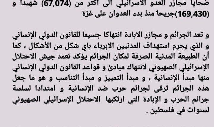 ندين و نستنكر بأشد العبارات استمرار سلسلة جرائم عدوان الاحتلال الإسرائيلي الصهيوني للشعب الفلسطيني حيث ارتفعت حصيلة ضحايا مجازر العدو الاسرائيلي الى اكثر من (67,074) شهيدا و (169,430)جريحاً منذ بدء العدوان على غزة