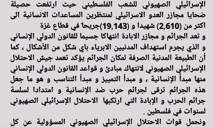 ندين و نستنكر بأشد العبارات استمرار سلسلة جرائم عدوان الاحتلال الإسرائيلي الصهيوني للشعب الفلسطيني حيث ارتفعت حصيلة ضحايا مجازر العدو الاسرائيلي لمنتظرين المساعدات الانسانية الى اكثر من (2,610) شهيدا و (19,143)جريحاً في قطاع غزة