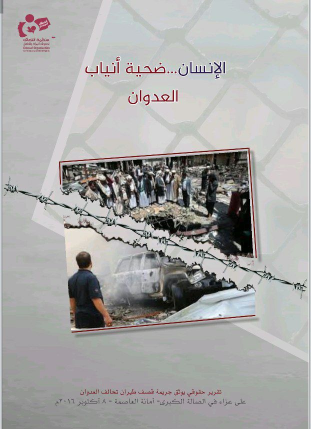 وثقت منظمة انتصاف لحقوق المرأة والطفل تقريراً حقوقياً بعنوان ” الانسان ضحية أنياب العدوان” حيث تناول التقرير الجريمة التي ارتكبها طيران تحالف العدوان على عزاء في الصالة الكبرى بأمانة العاصمة والتي را ح ضحيتها مدنيين بينهم نساء و أطفال، وذلك في يوم السبت بتاريخ 8 أكتوبر 2016م