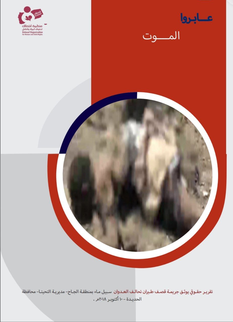 وثقت منظمة انتصاف لحقوق المرأة والطفل تقريراً حقوقياً بعنوان “عابروا الموت”حيث تناول التقرير الجريمة التي ارتكبها طيران تحالف العدوان على سبيل ماء بمنطقة الجاح _مديرية التحيتا _ محافظة الحديدة والتي را ح ضحيتها مدنيين بينهم نساء و أطفال، وذلك بتاريخ 10 اكتوبر 2018م