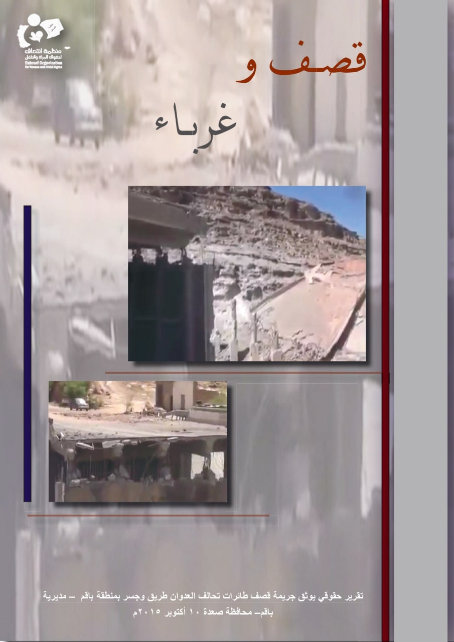 وثقت منظمة انتصاف لحقوق المرأة والطفل تقريراً حقوقياً بعنوان ” قصف و غرباء ” حيث تناول التقرير الجريمة التي ارتكبها طيران تحالف العدوان على طريق و جسر بمنطقة باقم – مدیریة باقم – محافظة صعدة والتي را ح ضحيتها مدنيين بينهم نساء و أطفال، وذلك في يوم السبت بتاريخ 10 أكتوبر 2015م