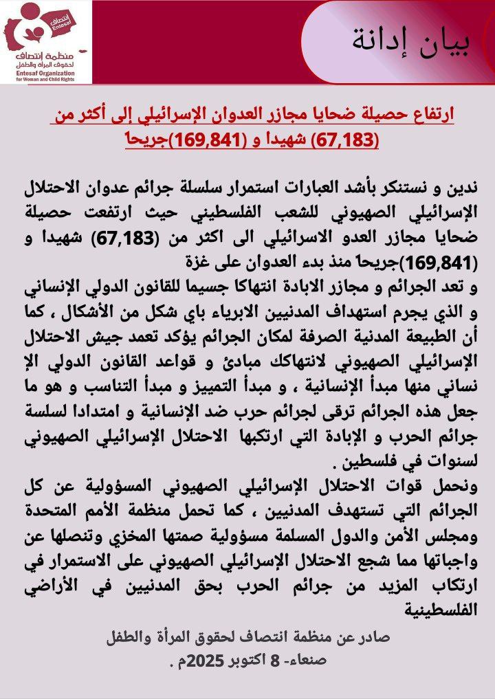 ندين و نستنكر بأشد العبارات استمرار سلسلة جرائم عدوان الاحتلال الإسرائيلي الصهيوني للشعب الفلسطيني حيث ارتفعت حصيلة ضحايا مجازر العدو الاسرائيلي الى اكثر من (67,183) شهيدا و (169,841)جريحاً منذ بدء العدوان على غزة
