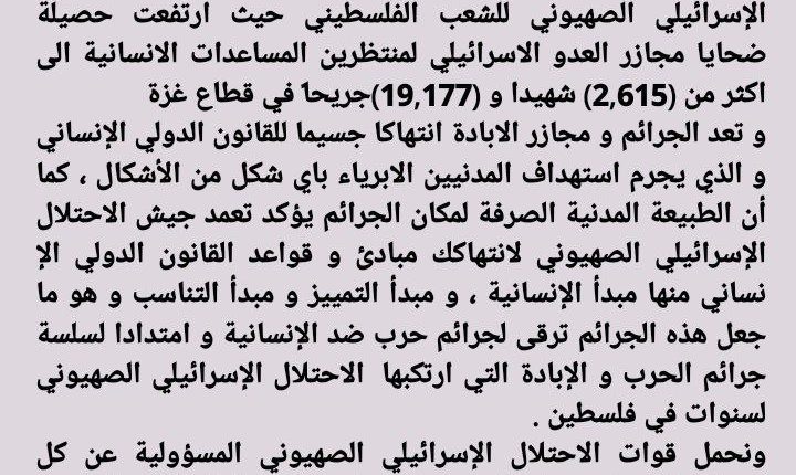ندين و نستنكر بأشد العبارات استمرار سلسلة جرائم عدوان الاحتلال الإسرائيلي الصهيوني للشعب الفلسطيني حيث ارتفعت حصيلة ضحايا مجازر العدو الاسرائيلي لمنتظرين المساعدات الانسانية الى اكثر من (2,615) شهيدا و (19,177)جريحاً في قطاع غزة