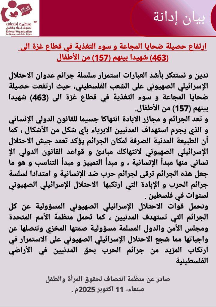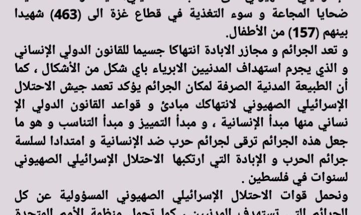 ندين و نستنكر بأشد العبارات استمرار سلسلة جرائم عدوان الاحتلال الإسرائيلي الصهيوني على الشعب الفلسطيني، حيث ارتفعت حصيلة ضحايا المجاعة و سوء التغذية في قطاع غزة الى (463) شهيدا بينهم (157) من الأطفال.