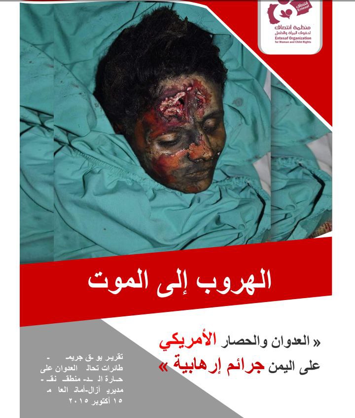 وثقت منظمة انتصاف لحقوق المرأة والطفل تقريراً حقوقياً بعنوان ” الهروب الى الموت ” حيث تناول التقرير الجريمة التي ارتكبها طيران تحالف العدوان على حارة السدة بمنطقة نقم بمديرية أزال التابعة لامانة العاصمة والتي را ح ضحيتها مدنيين بينهم نساء و أطفال، وذلك في يوم الجمعة بتاريخ 15 أكتوبر 2015م