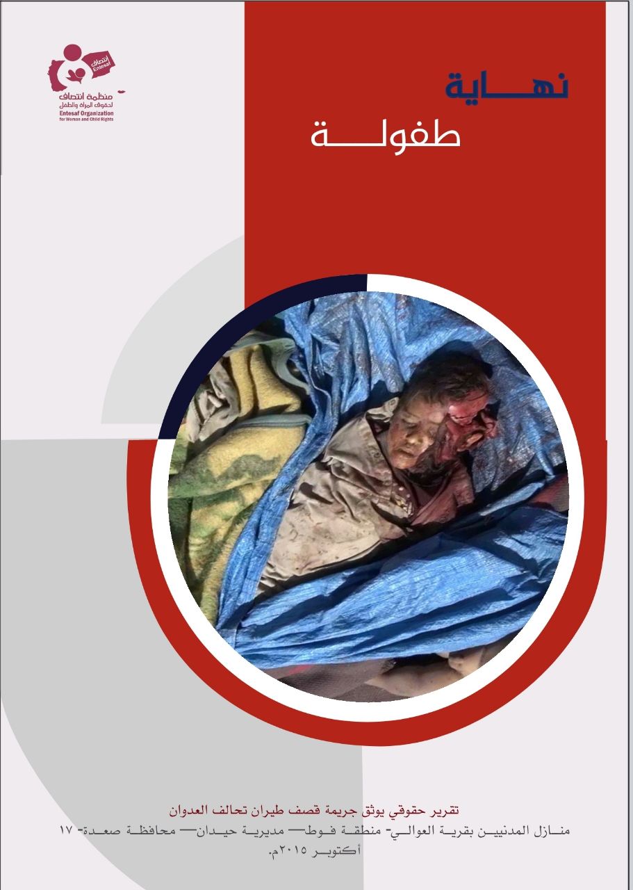 أصدرت منظمة انتصاف لحقوق المرأة والطفل تقريراً حقوقياً بعنوان “نهاية طفوله”حيث تناول التقرير الجريمة التي ارتكبها طيران تحالف العدوان على منازل المواطنين بقرية العوالي منطقة فوط بمديرية حيدان التابعة لمحافظة صعدة والتي را ح ضحيتها مدنيين بينهم نساء و أطفال، وذلك بتاريخ 17 اكتوبر 2015م