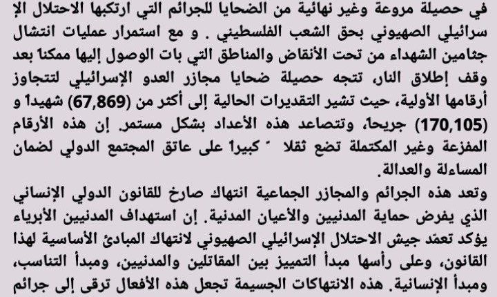 في حصيلة مروعة وغير نهائية من الضحايا للجرائم التي ارتكبها الاحتلال الإسرائيلي الصهيوني بحق الشعب الفلسطيني . و مع استمرار عمليات انتشال جثامين الشهداء من تحت الأنقاض والمناطق التي بات الوصول إليها ممكناً بعد وقف إطلاق النار، تتجه حصيلة ضحايا مجازر العدو الإسرائيلي لتتجاوز أرقامها الأولية، حيث تشير التقديرات الحالية إلى أكثر من (67,869) شهيداً و (170,105) جريحاً، وتتصاعد هذه الأعداد بشكل مستمر. إن هذه الأرقام المفزعة وغير المكتملة تضع ثقلاً كبيراً على عاتق المجتمع الدولي لضمان المساءلة والعدالة.