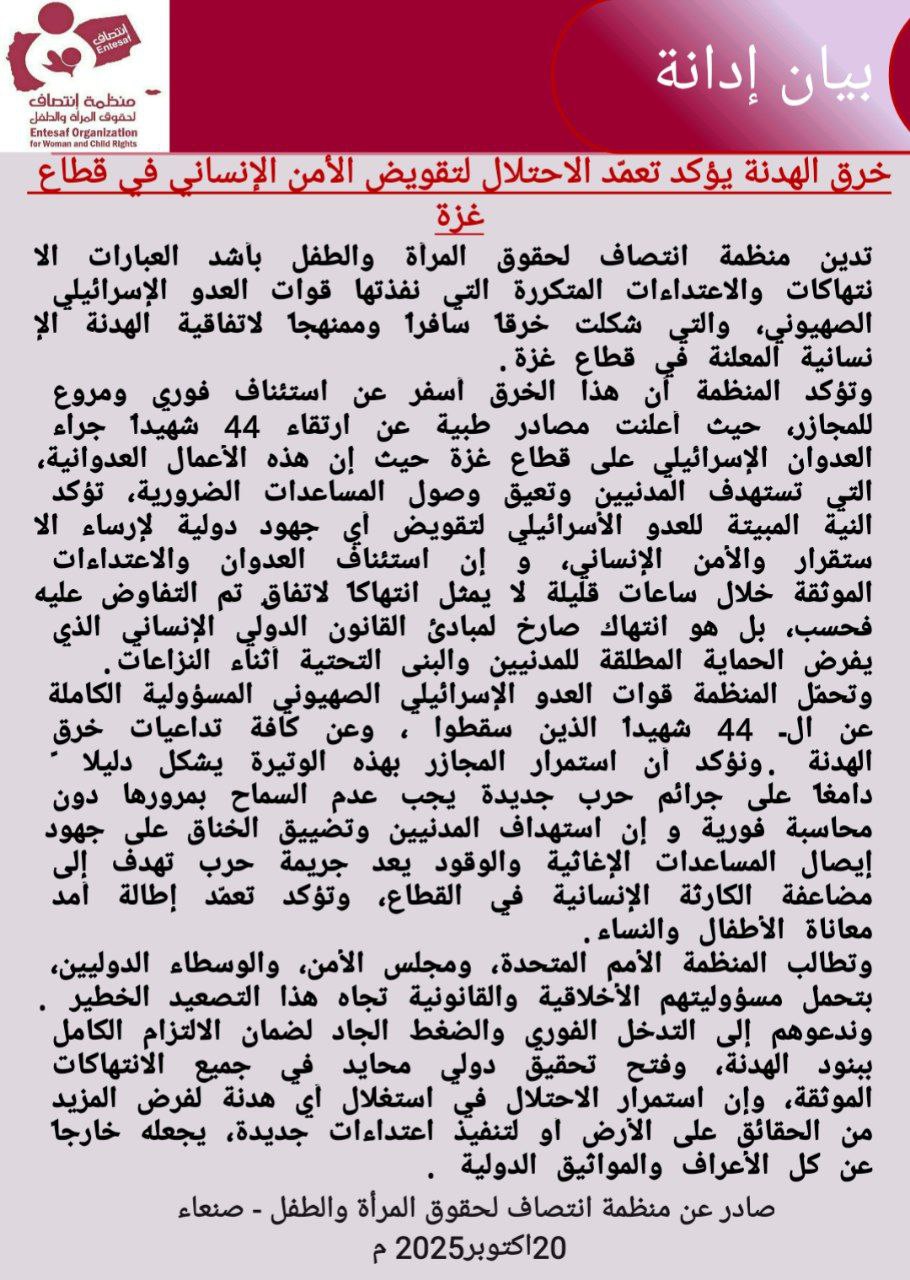 صادر عن منظمة انتصاف لحقوق المرأة والطفل – صنعاء