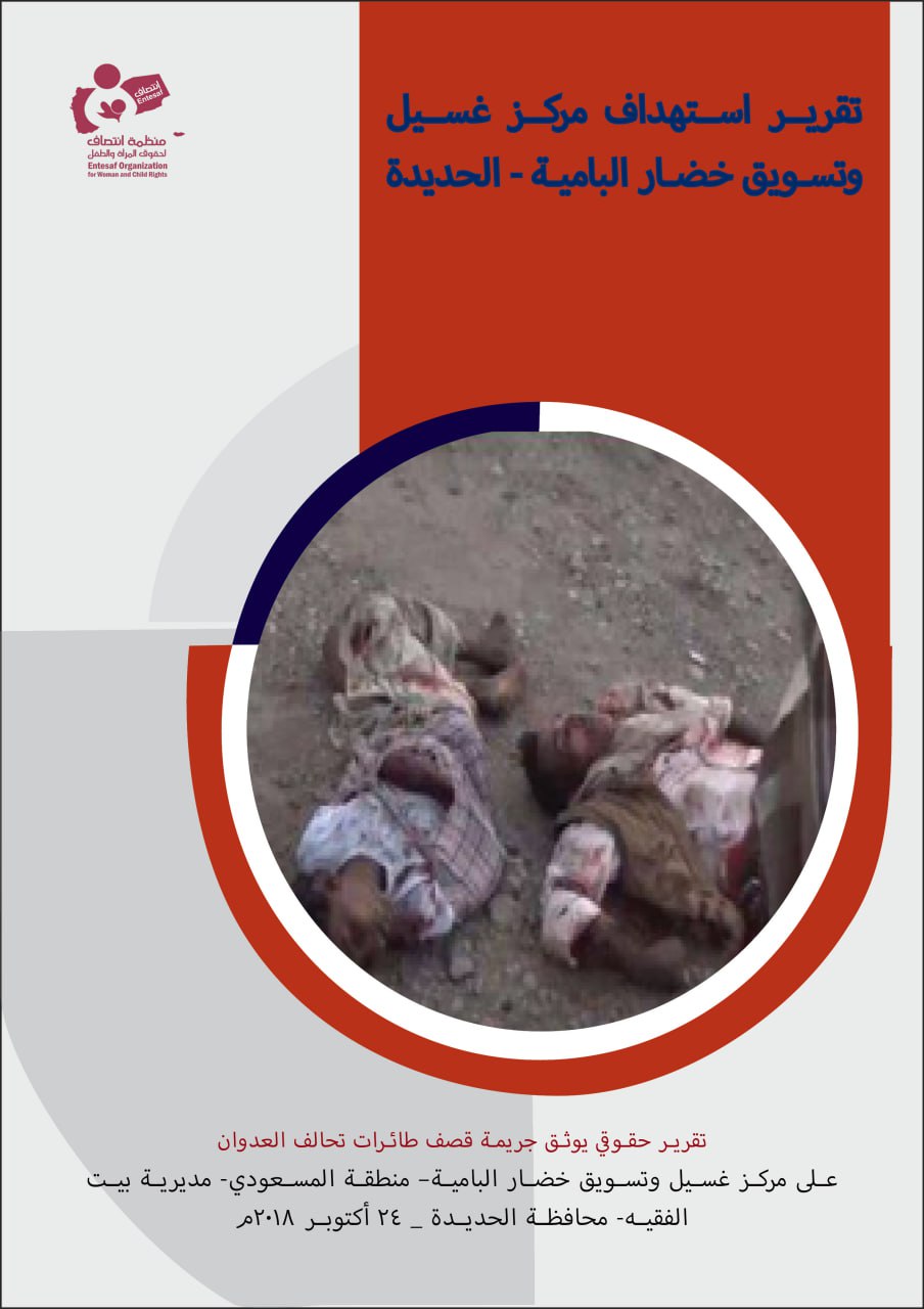 وثقت منظمة انتصاف لحقوق المرأة والطفل تقريراً حقوقياً بعنوان ” تقرير استهداف مركز غسيل و تسويق خضار البامية بمنطقة المسعودي محافظة الحديدة” حيث تناول التقرير جريمة قصف طيران تحالف العدوان على مركز غسيل و تسويق خضار البامية بمنطقة المسعودي بمديرية بيت الفقيه التابعة لمحافظة الحديدة والتي راح ضحيتها مدنيين بينهم نساء و أطفال، وذلك بتاريخ 24 اكتوبر 2018م