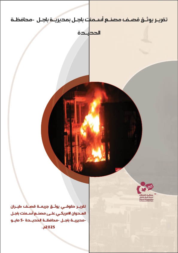 اصدرت منظمة انتصاف لحقوق المرأة والطفل تقريراً حقوقياً يوثق “استهداف مصنع أسمنت باجل بمديرية باجل بمحافظة الحديدة “حيث تناول التقرير جريمة قصف طيران العدوان الامريكي على مصنع أسمنت باجل بمديرية باجل بمحافظة الحديدة والتي راح ضحيتها مدنيين بينهم نساء و أطفال، وذلك بتاريخ 5 مايو 2025م