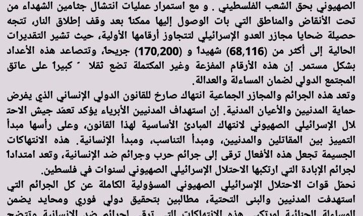 نحمّل قوات الاحتلال الإسرائيلي الصهيوني المسؤولية الكاملة عن كل الجرائم التي استهدفت المدنيين والبنى التحتية، مطالبين بتحقيق دولي فوري ومحايد يضمن المساءلة الجنائية لمرتكبي هذه الانتهاكات التي ترقى لجرائم ضد الإنسانية وتتضح فظاعتها يوماً بعد يوم مع استمرار انتشال الضحايا.