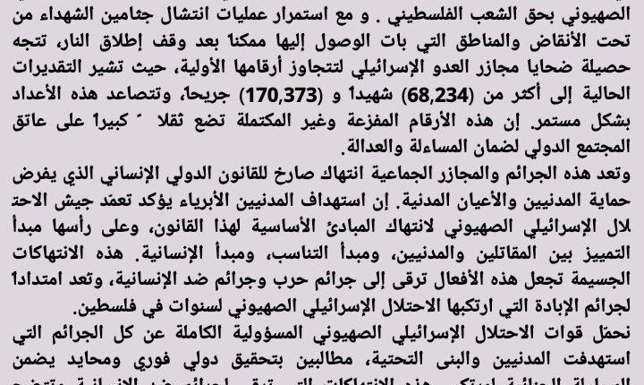 في حصيلة مروعة وغير نهائية من الضحايا للجرائم التي ارتكبها الاحتلال الإسرائيلي الصهيوني بحق الشعب الفلسطيني . و مع استمرار عمليات انتشال جثامين الشهداء من تحت الأنقاض والمناطق التي بات الوصول إليها ممكناً بعد وقف إطلاق النار، تتجه حصيلة ضحايا مجازر العدو الإسرائيلي لتتجاوز أرقامها الأولية، حيث تشير التقديرات الحالية إلى أكثر من (68,234) شهيداً و (170,373) جريحاً، وتتصاعد هذه الأعداد بشكل مستمر. إن هذه الأرقام المفزعة وغير المكتملة تضع ثقلاً كبيراً على عاتق المجتمع الدولي لضمان المساءلة والعدالة.