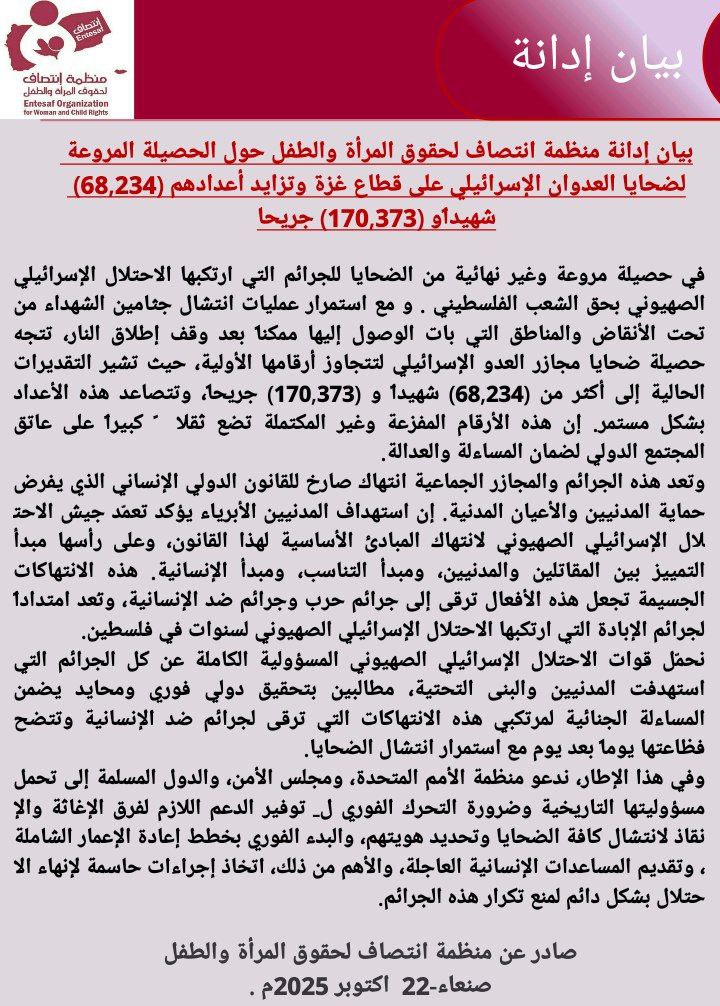 صادر عن منظمة انتصاف لحقوق المرأة والطفل صنعاء