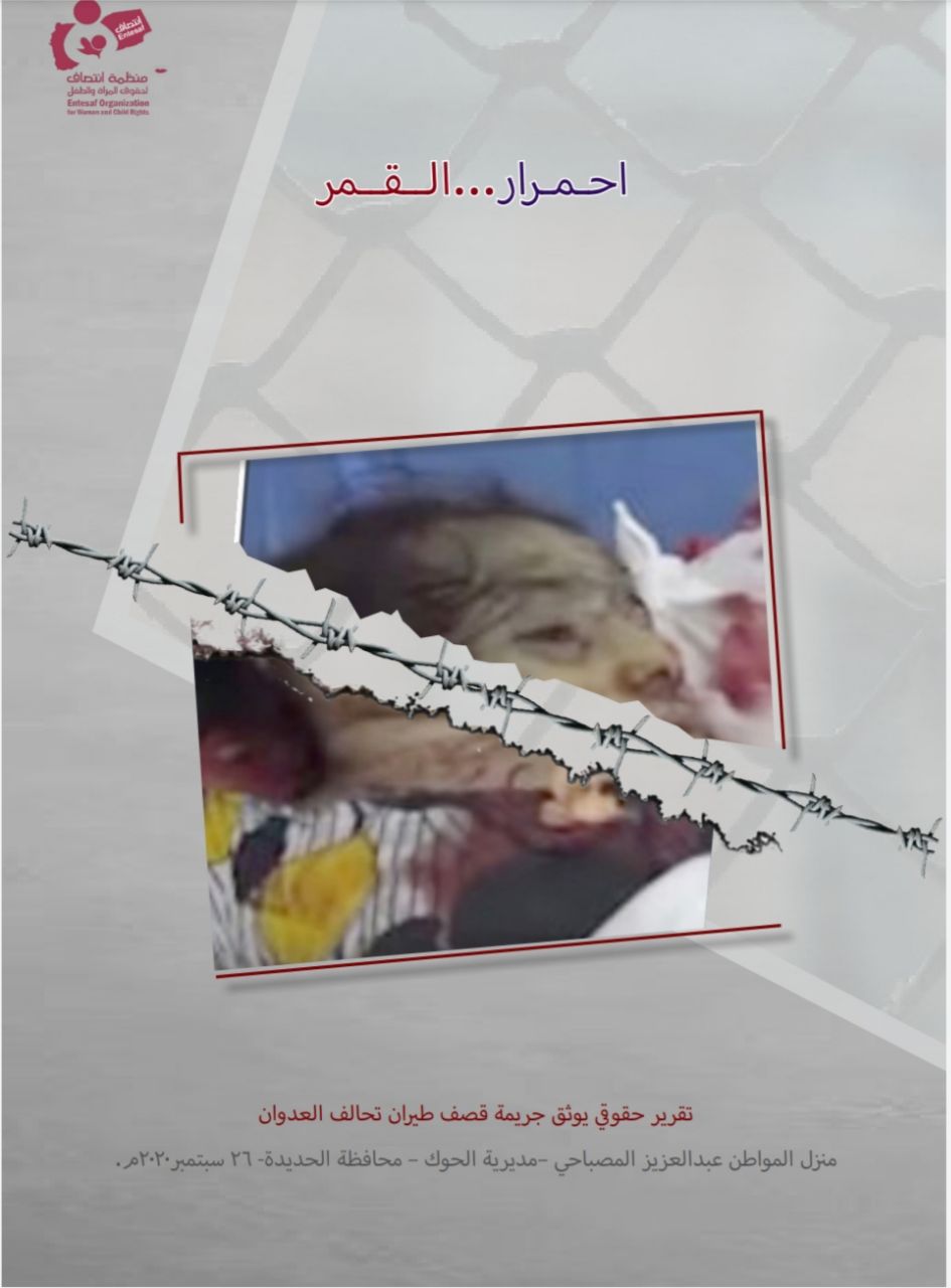 وثقت منظمة انتصاف لحقوق المرأة والطفل تقريراً حقوقياً بعنوان”احمرار القمر” حيث تناول التقرير الجريمة التي ارتكبها طيران تحالف العدوان على منزل المواطن عبد العزيز المصباحي بمديرية الحوك التابعة لمحافظة الحديدة والتي را ح ضحيتها مدنيين بينهم نساء و أطفال، وذلك بتاريخ 26 اكتوبر 2020م