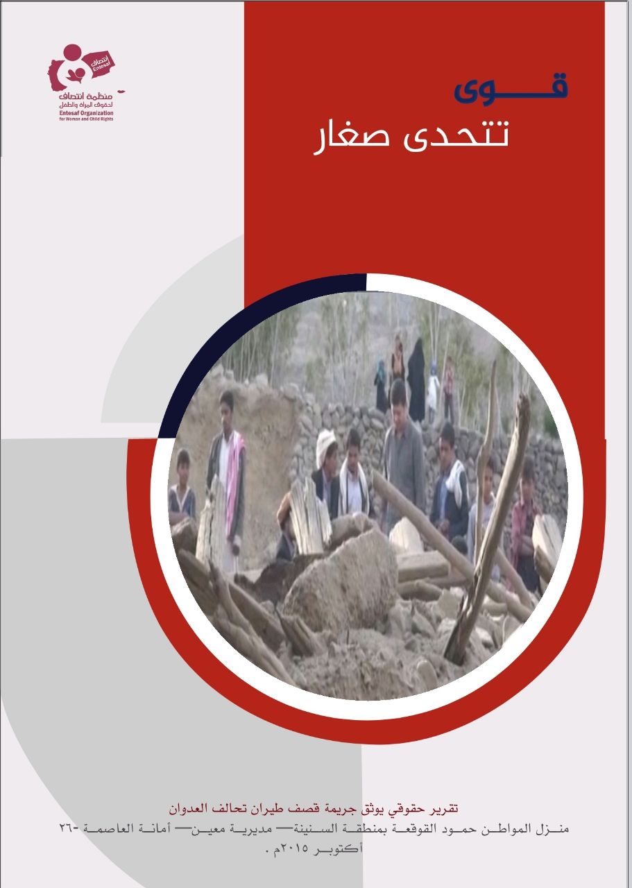 وثقت منظمة انتصاف لحقوق المرأة والطفل تقريراً حقوقياً بعنوان “قوى تتحدى صغار” حيث تناول التقرير الجريمة التي ارتكبها طيران تحالف العدوان على منزل المواطن حمود القوقعة بمنطقة السنينة بمديرية معين امانة العاصمة والتي را ح ضحيتها مدنيين بينهم نساء و أطفال، وذلك بتاريخ 26 اكتوبر 2015م