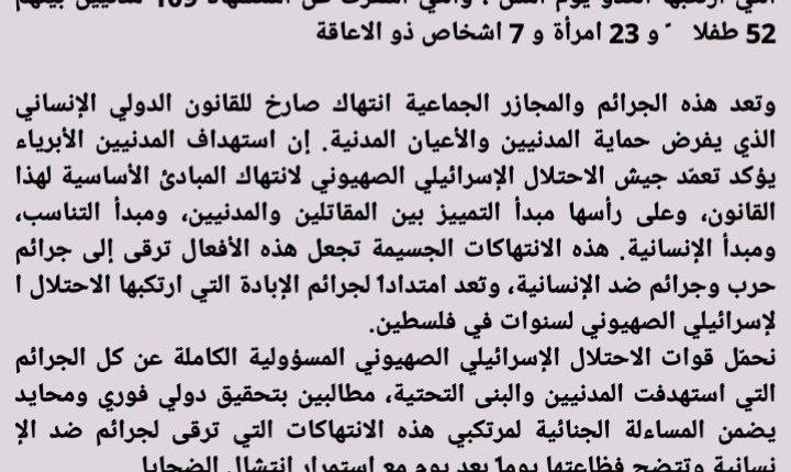بيان إدانة بشأن جرائم العدو الأسرائيلي في غزة التى اسفر عنها مجرزة استشهاد فيها 109 مدني بينهم 52 طفلاً و 23 امرأة و 7 اشخاص ذو الاعاقة