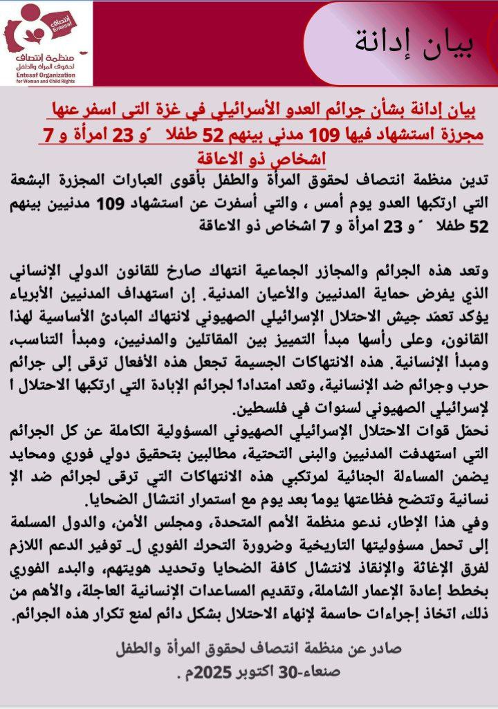 بيان إدانة بشأن جرائم العدو الأسرائيلي في غزة التى اسفر عنها مجرزة استشهاد فيها 109 مدني بينهم 52 طفلاً و 23 امرأة و 7 اشخاص ذو الاعاقة
